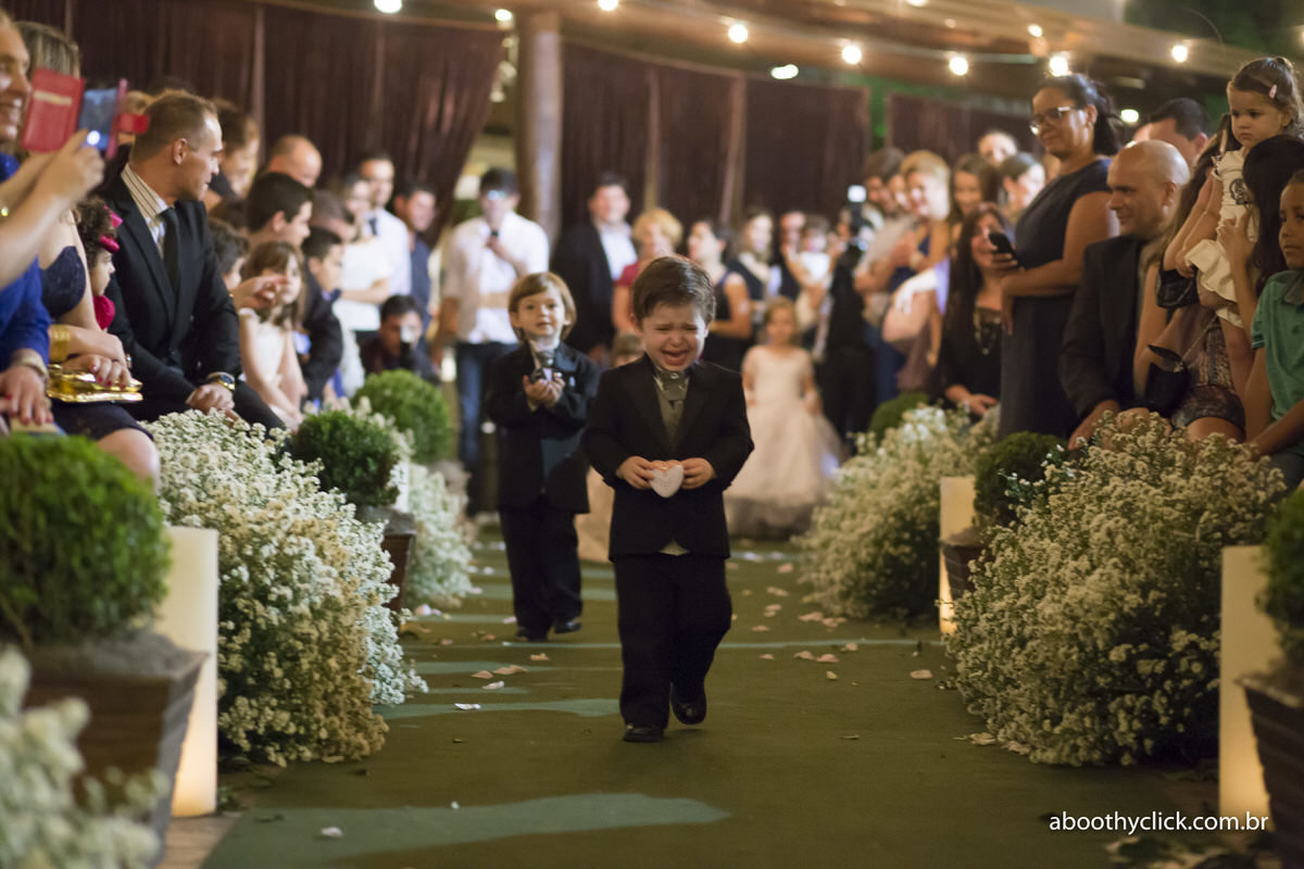 Seja levando as plaquinhas com mensagens fofas ao noivo, como um segurança levando as alianças, como florista jogando petálas no caminho para o altar, segurando ursinhos, brinquedos ou até mesmo bebês em carrinhos motorizados – eles sempre fazem sucesso e surpreendem os noivos e convidados.